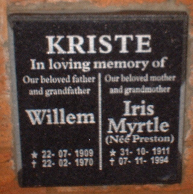 Iris married Willem Kriste, son of Gerardus Jacobus Kriste and Harmijntje Gerdina Heermans. (Willem Kriste was born on 22 Jul 1909, died on 22 Feb 1970 and was buried in Rebecca Street Cemetery, Pretoria, Transvaal.) |