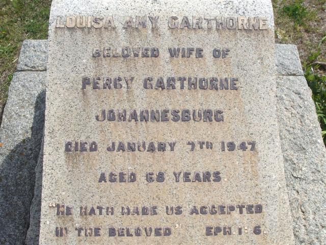 Louisa married Percy Garthorne, son of Charles Henry Garthorne and Jane Strother, circa 1896 in South Africa.1 (Percy Garthorne was born on 20 Oct 1867 in England 1 and died on 27 Apr 1948 in Johannesburg, Transvaal, South Africa 1.) |