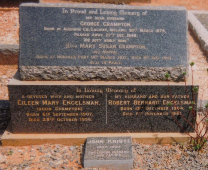 2 "Marriage Notice," (Kimberley, South Africa) Diamond Fields Advertiser, 09 Sep 1931, p. 2, col. 1; ENGELSMAN - CRAMPTON - Married at St. Cyprian's Cathedral on Saturday, September 5th, by the Very Rev. Dean Robson, Robert Bernard Engelsman, eldest son of the late Mr. and Mrs. George Engelsman, of Klipdam, to Eileen Mary Crampton, eldest daughter of Mr. and Mrs. George Crampton, of Kimberley. - b3505