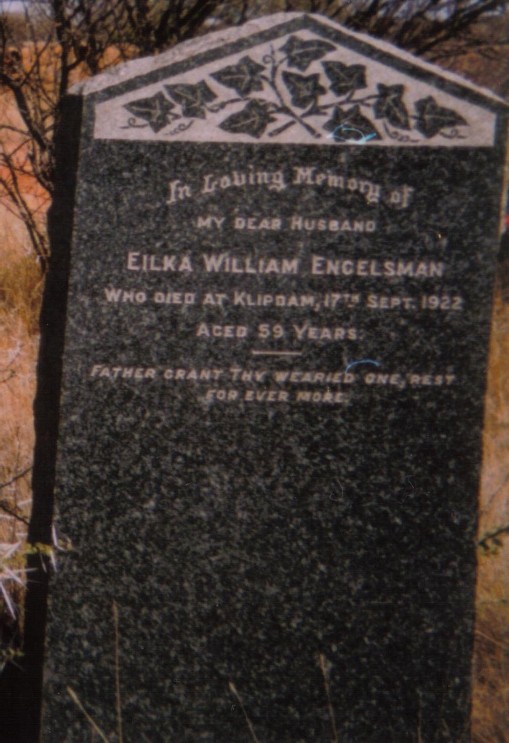• Residence: Union of South Africa, 1922. Eilka married Johanna Elizabeth van der Westhuisen on 9 Nov 1886 in St. Mary's Church, Barkly West, Northern Cape, South Africa.1 (Johanna Elizabeth van der Westhuisen was born circa 1867 1.) |