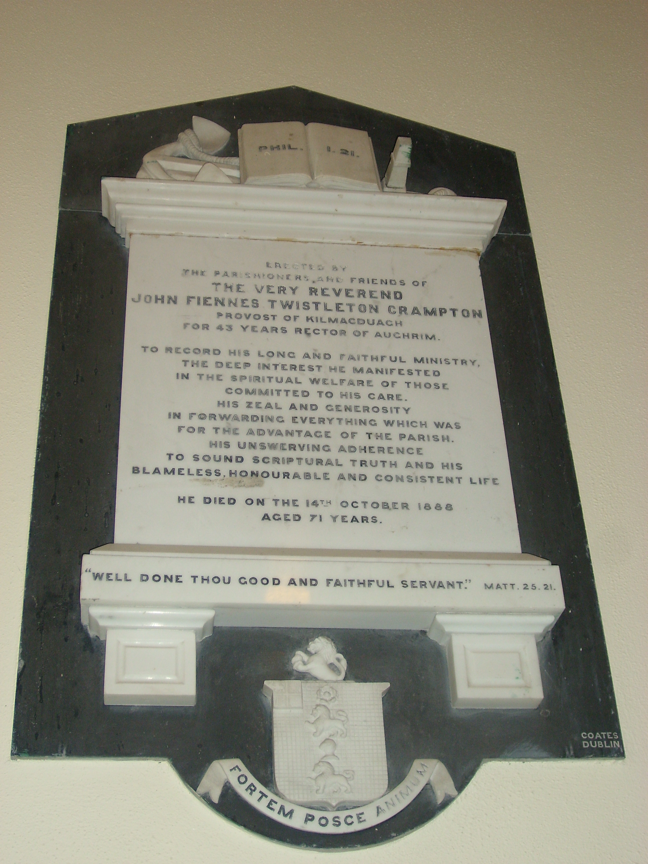 • Occupation: Rector of Aughrim, 1845-1888, Aughrim, Galway, Connacht, Ireland. • Presentation: Address and presentation to the Rev. John F. T. Crampton, Rector of Aughrim, by his Parishioners, 4 Jul 1873, Infant School House, Aughrim, Galway, Connacht, Ireland. We feel great pleasure in directing the attention of our readers to an advertisement in our columns with reference to the pleasing announcement of an address and presentation to the Rev. John F. T. Crampton, Rector of Aughrim, by his Parishioners. Both speak well for the kind and cordial feeling existing in that parish between pastor and people. John married Anna Handcock, daughter of Arthur Handcock and Hon. Margaret Downing, on 1 May 1845 in Ballinasloe Church, Ballinasloe, Galway, Connacht, Ireland.1 (Anna Handcock was born circa 1820, died on 1 Aug 1855 13 and was buried on 5 Aug 1855 in Churchyard, Holy Trinity Aughrim, Co. Galway 14.)